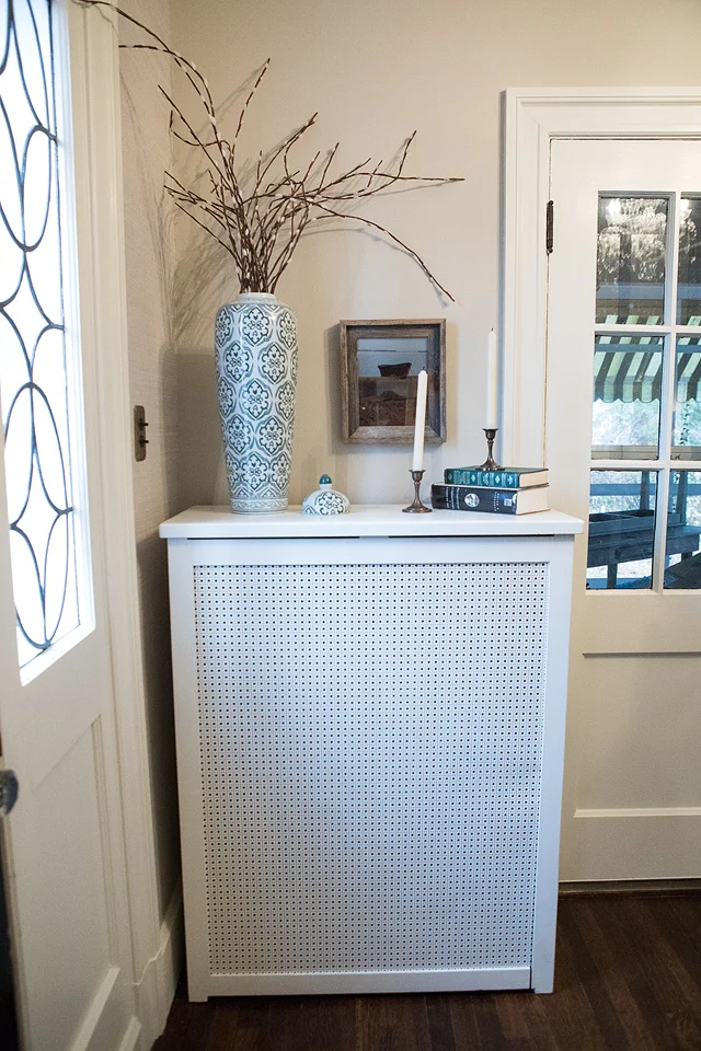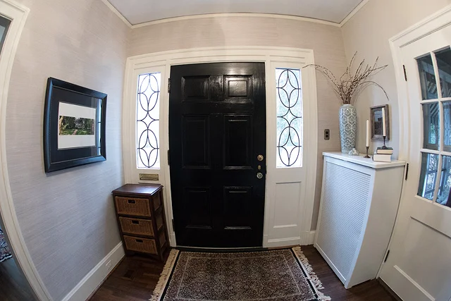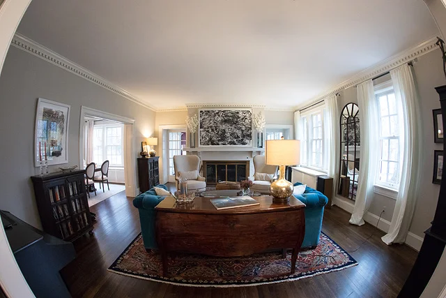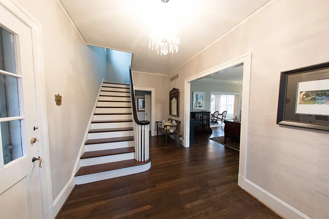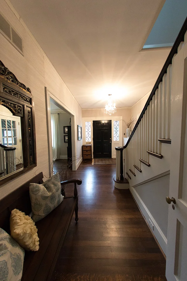 The Foyer was refreshed, as well. Three of the walls now have a metallic grasscloth wallpaper adding texture, interest, and a shimmer to the entryway. We kept the original crystal chandelier...the wallpaper and the chandelier really play well off of each other. The staircase feels lighter and brighter, too, with a fresh coat of white paint to the risers and the spindles...what a difference! We added a few decorative pieces to the radiator cover, including a ginger jar accented in the peacock color that marries the foyer to the living room.