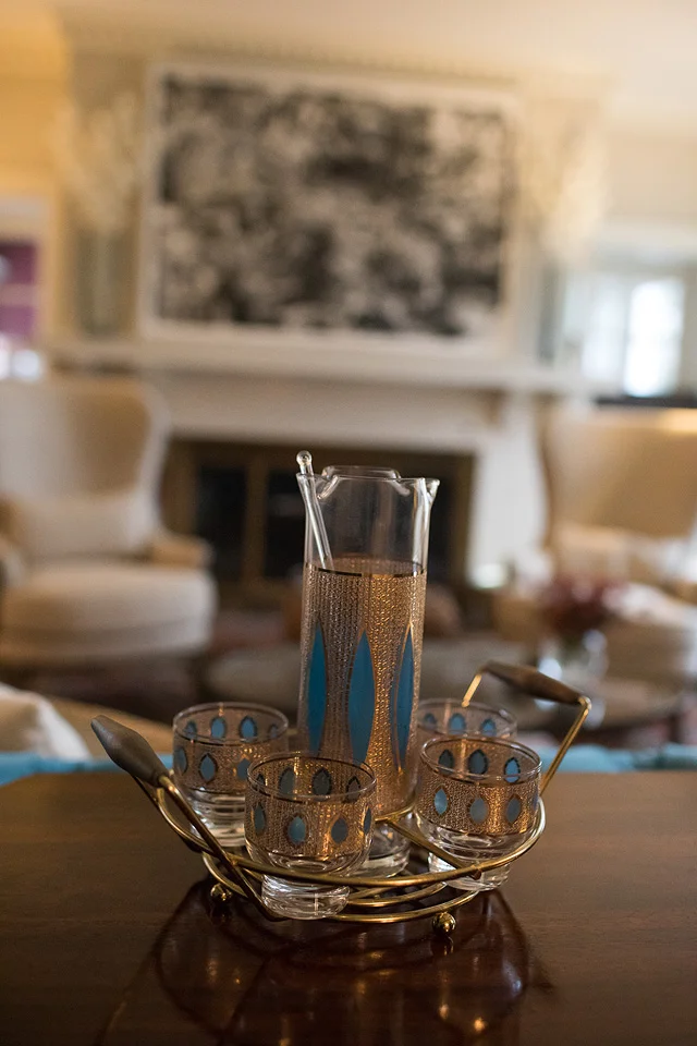 Peacock blue & gold cocktail set: belonged to client's mother from 1960’s helps tell the client's story.