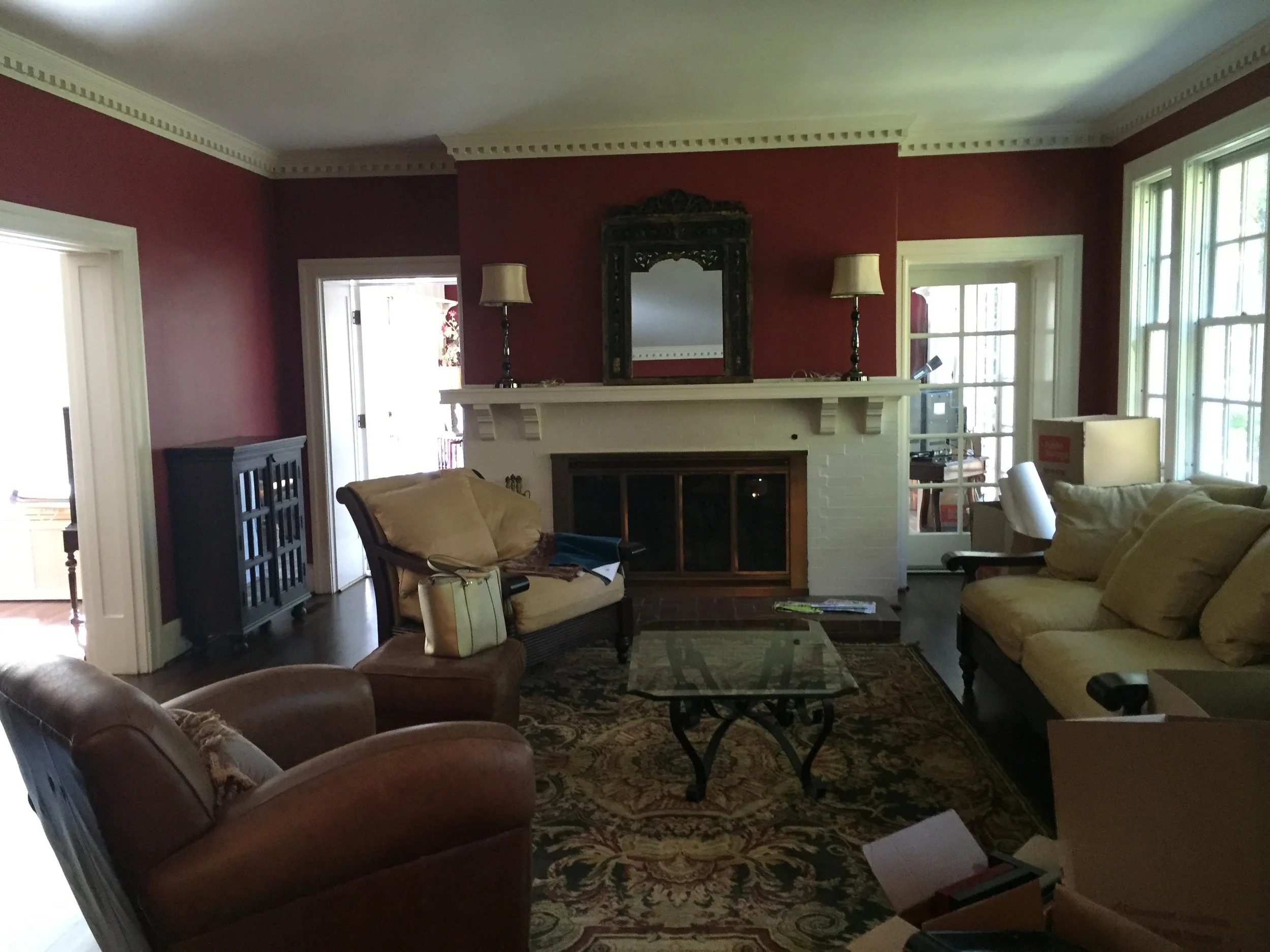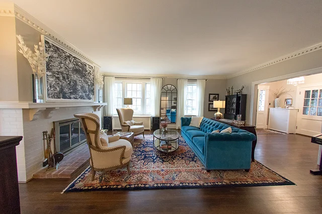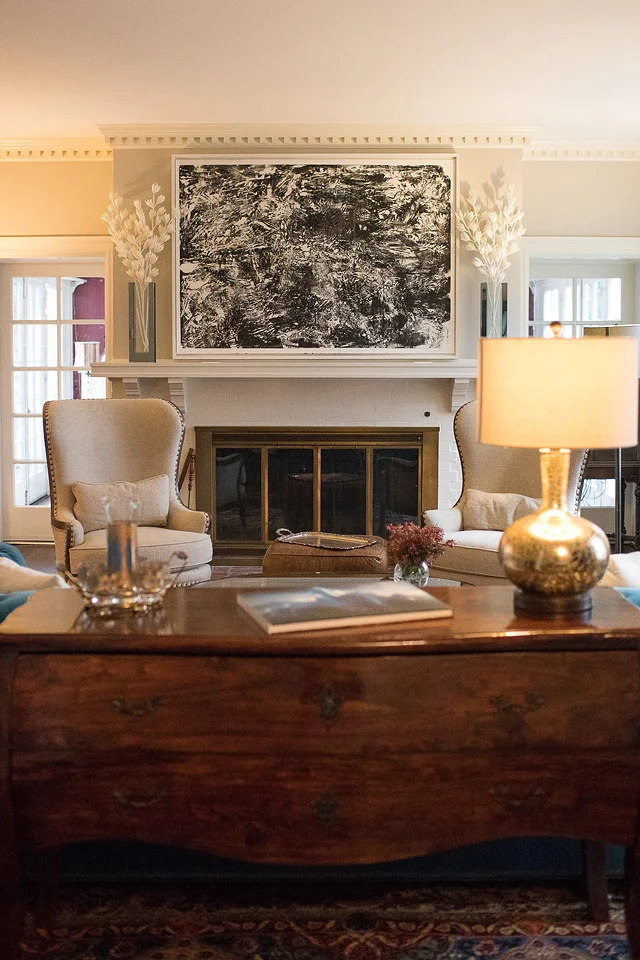 Fresh new paint on the walls lighten everything up transforming the room immediately. A gorgeous turfed velvet sofa in a bright peacock color is just the pop of color my client wanted. It pairs well with the barrel back chairs that flank the stately fireplace. The back of chairs boast a bold wooden design that mimics the hull of a ship, and the antique gold railheads add even more detail. The windows feel lighter, brighter and softer with the new linen curtain panels and the large paneled mirror in an antique gold finish reflects the beauty of the room. The entire space is anchored by the size, weight and rich colors of the refurbished antique Asian rug...simply gorgeous. The true show stopper in the room is the larger than life commissioned piece of art above the fireplace.